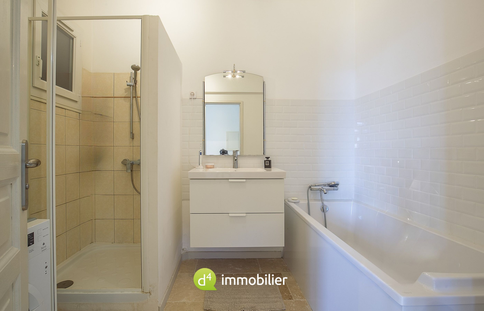 Sol en travertin pour un rendu chic et naturel.