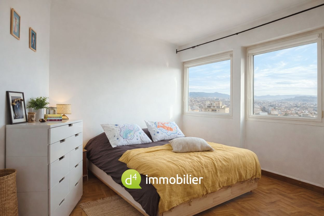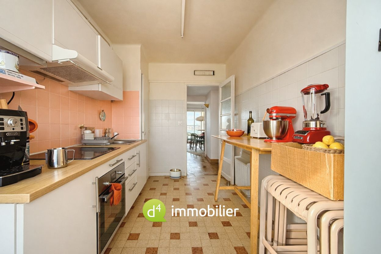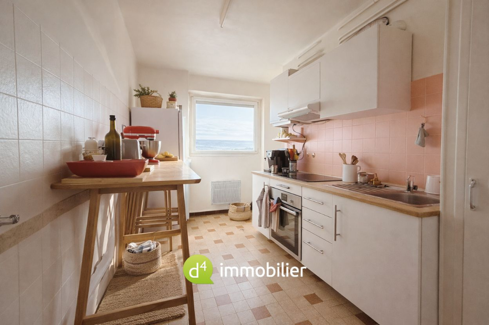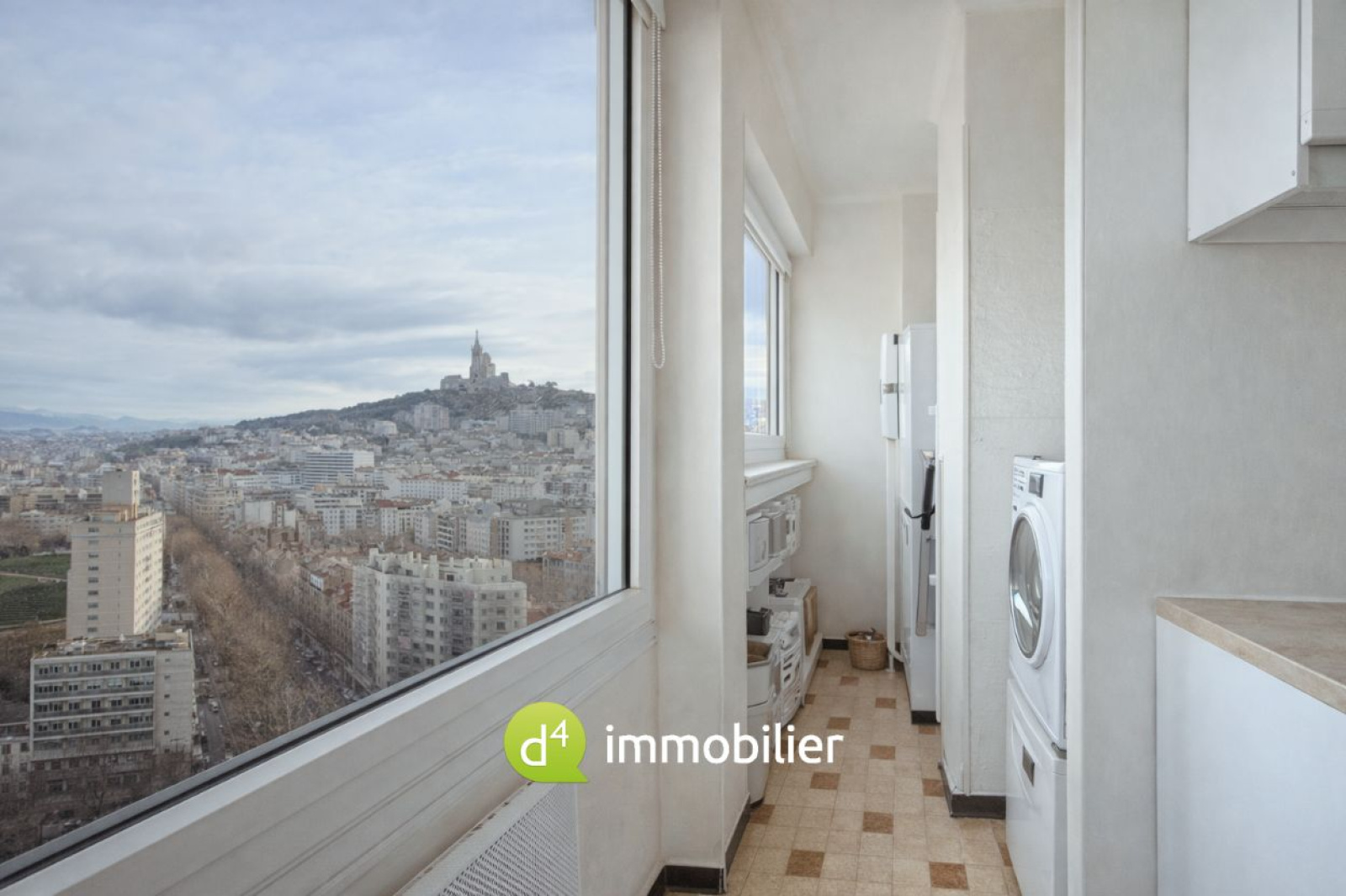 La cuisine, installée dans une pièce dédiée, présente des éléments visibles sur les photos : meubles blancs, plan de travail bois, crédence carrelée rose, évier inox et hotte. Les fenêtres coté chambre et cuisine cadrent la mer d’un coté et Notre dame de la garde de l’autre, offrant un point de repère constant dans l’appartement.