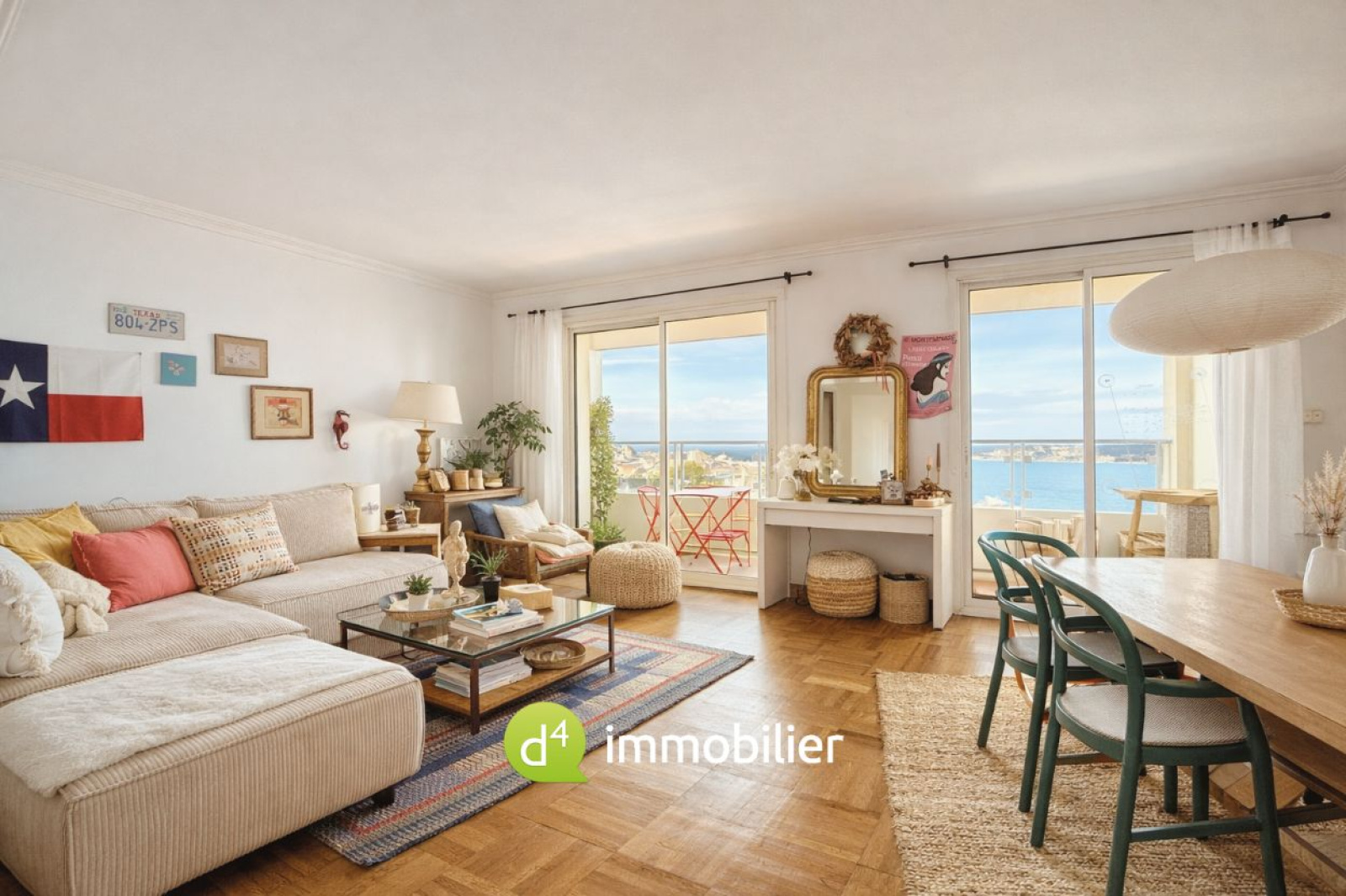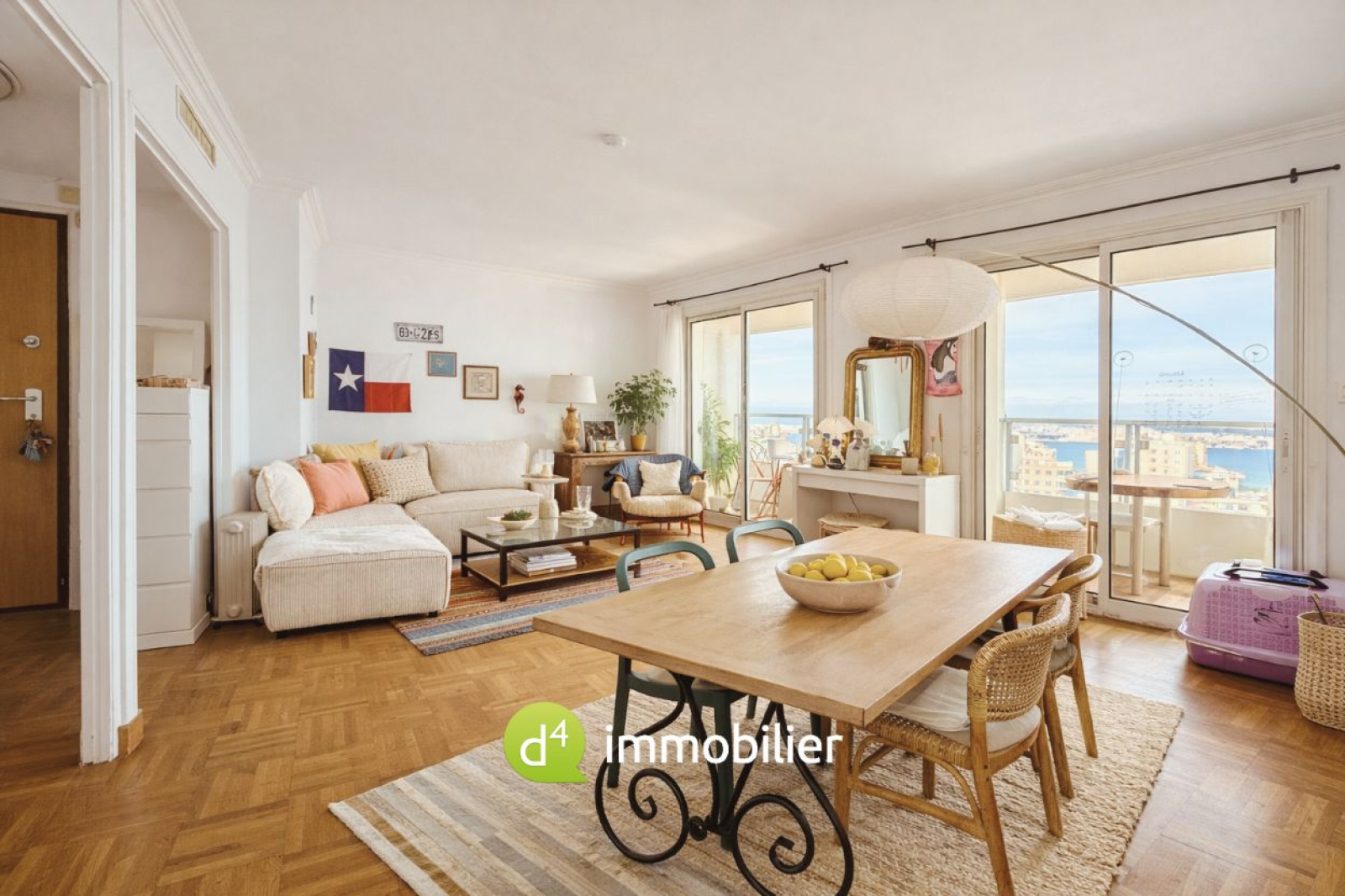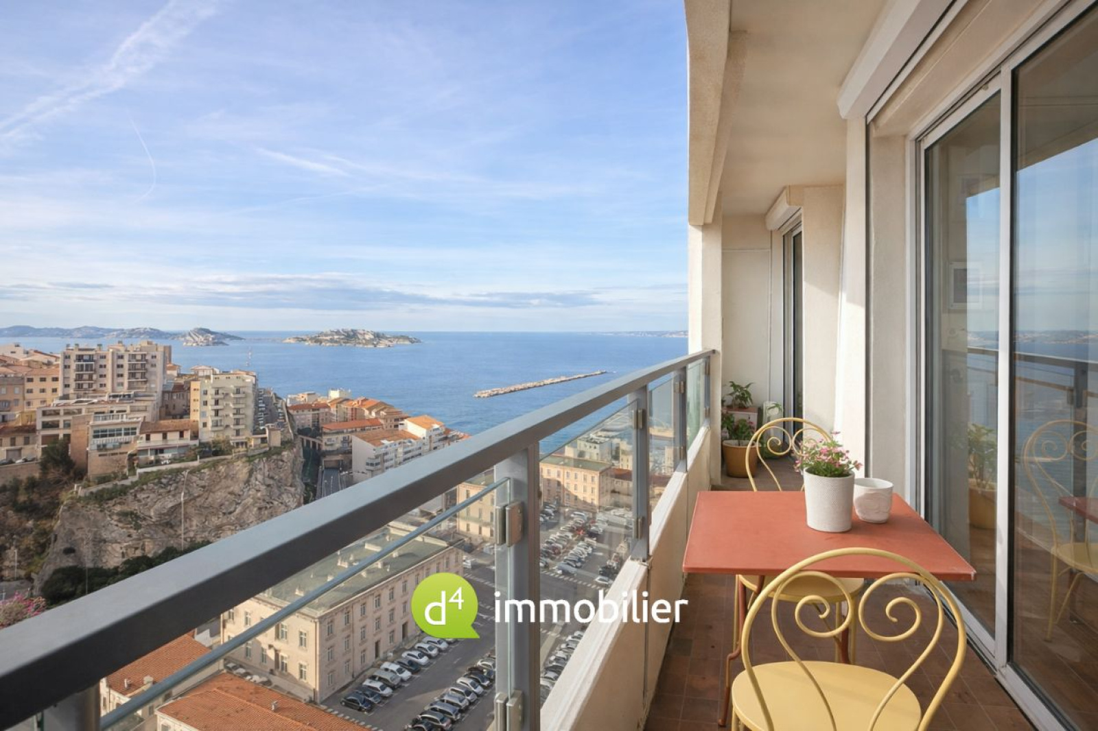 Au sein de la résidence Le Saint Georges, cet appartement situé au 18e étage s’ouvre sur un élément immédiatement perceptible : la vue mer, visible depuis le balcon et également depuis plusieurs fenêtres. Depuis l’extérieur, le garde-corps vitré laisse le regard filer vers l’horizon, avec la mer en ligne de fuite et des îles au large.
