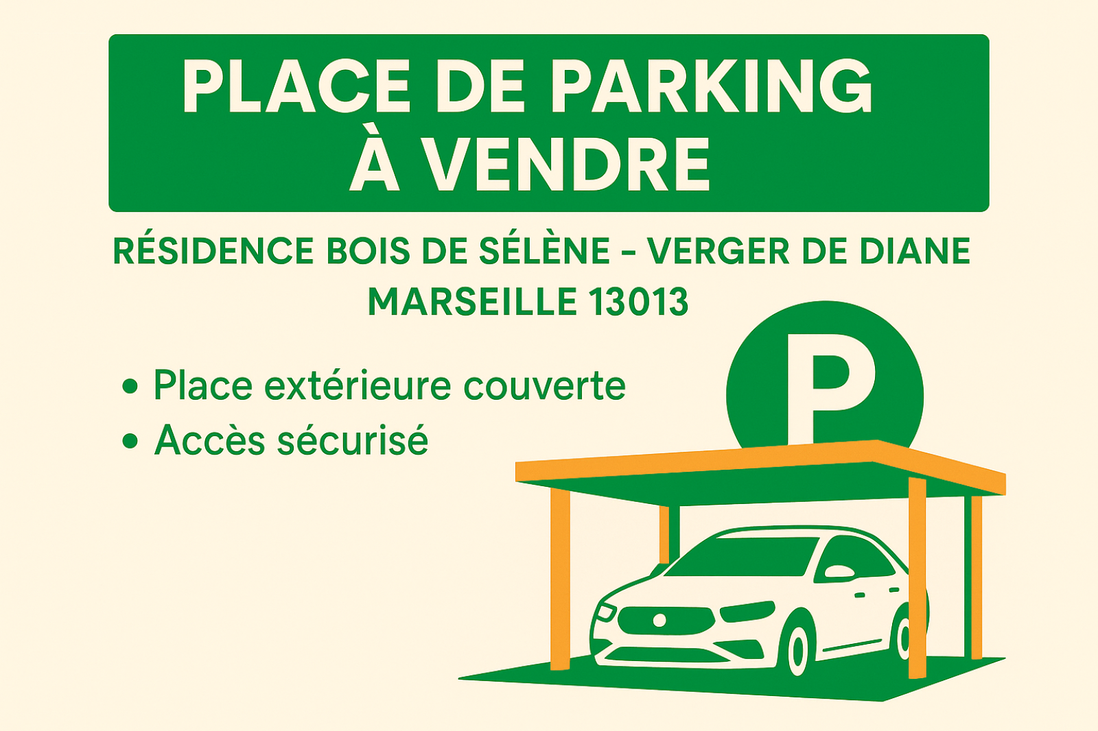 À vendre place de parking couverte dans la résidence moderne et sécurisée Bois de Sélène/Verger de Diane, située 21 rue Paul Preboist, Marseille 13ème.
